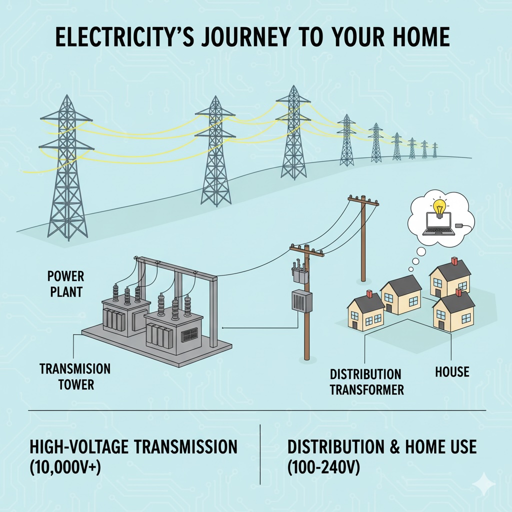 だから「超高電圧」にして送電線で運び、町に近づくと「安全な100V」に下げます。