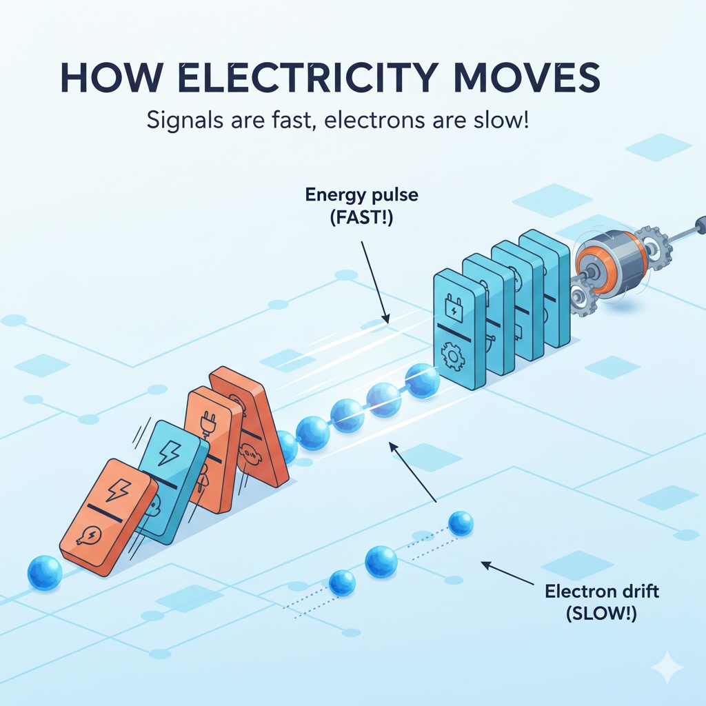意外かもしれませんが、電子そのものの移動はとても遅く、1秒で数ミリ〜数センチくらいしか進みません。