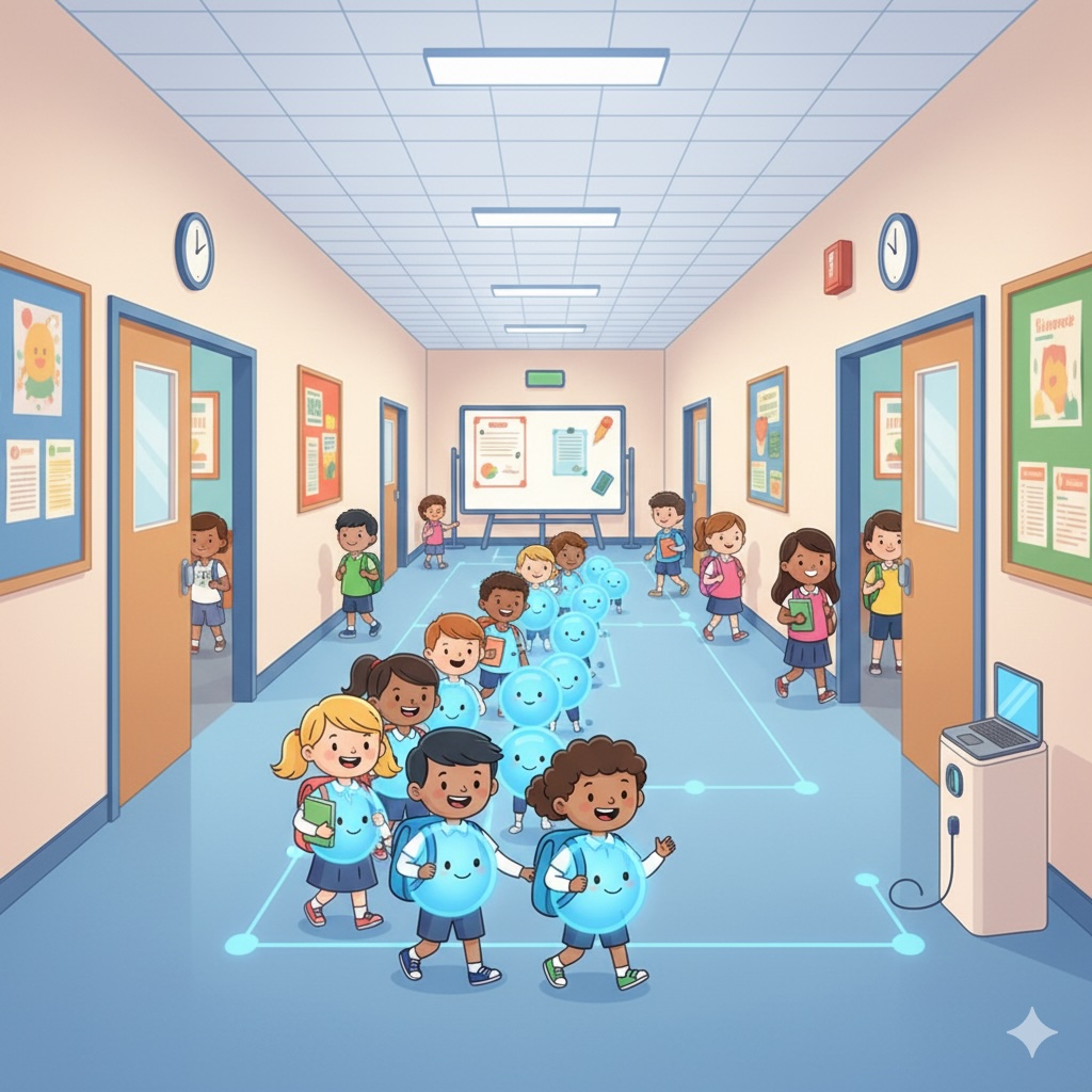 → 学校帰りの生徒が 行列になって廊下を歩いている。