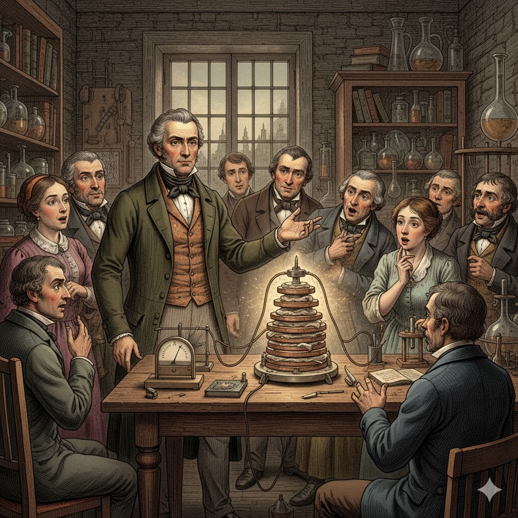 1800年、イタリアのアレッサンドロ・ボルタは「電堆(voltaic pile)」を発明し、安定的に電流を取り出せる仕組みを発見しました。