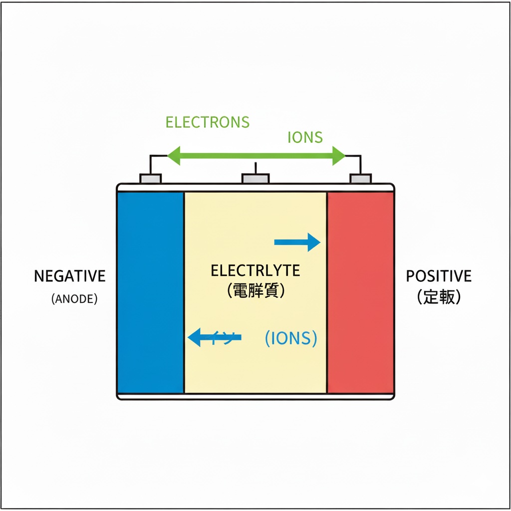 化学反応が負極から電子を放出し、電子は外部回路を通って正極に到達。これが電流となります。イオンは電解質を通って内部を移動し、回路を完成させます。