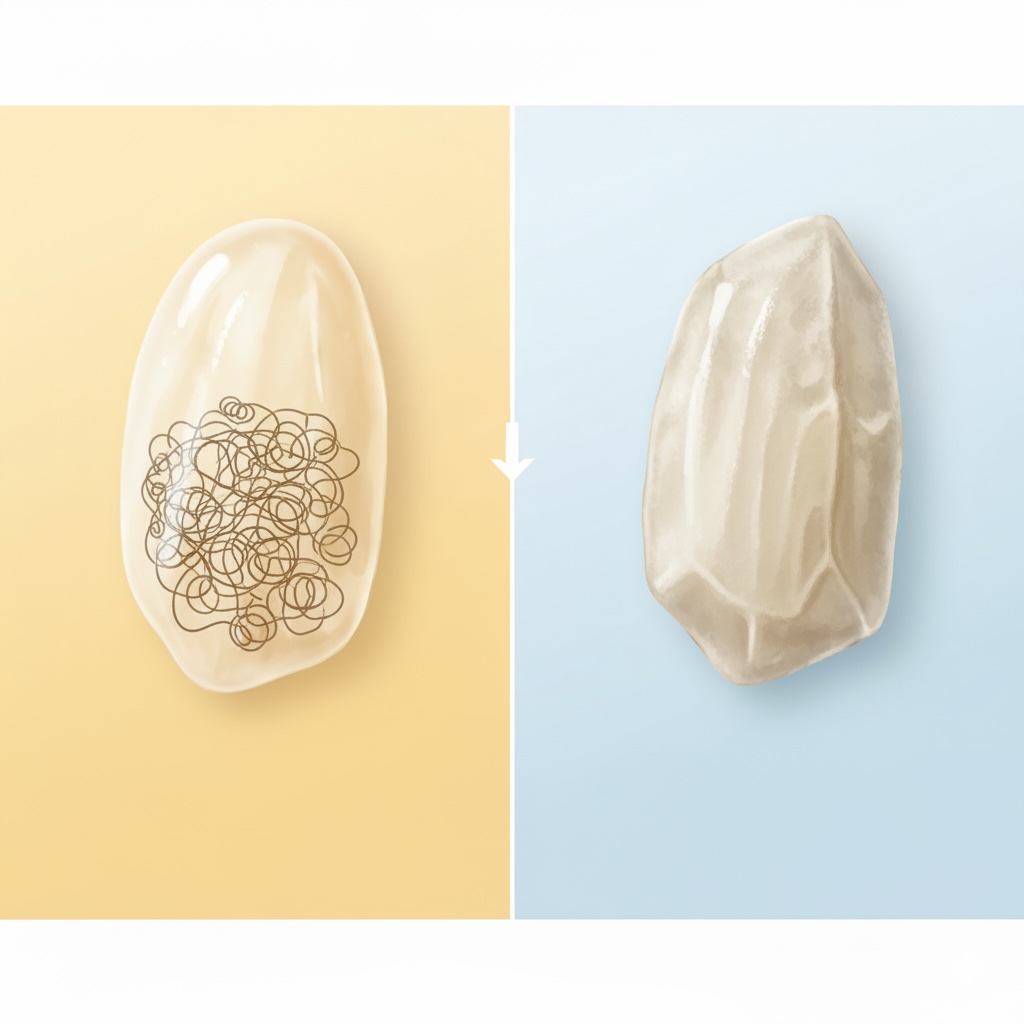 - 分子の再集合: 炊きたてのαデンプンは、デンプン分子(アミロースやアミロペクチン)がバラバラになった、非常に不安定で無秩序な状態です。
