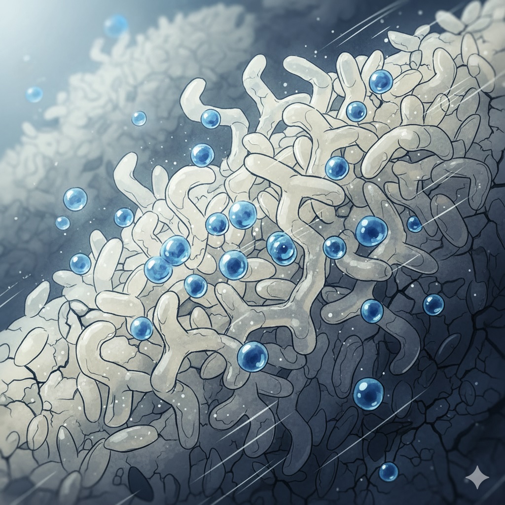 - 水の放出(分子の復讐): 温度が低下すると、バラバラだったデンプン分子は互いに引き寄せ合い、再び整然とした硬い結晶構造を形成し始めます。このとき、分子の間に抱え込んでいた水分を外に放出し始めます。