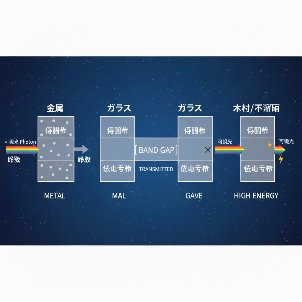 それは、ガラスを構成する原子の電子が、可視光の光子エネルギーに対して、量子力学的に電子が存在できない「非常に広いエネルギーの壁(バンドギャップ)」を持っているため、光を吸収しません。