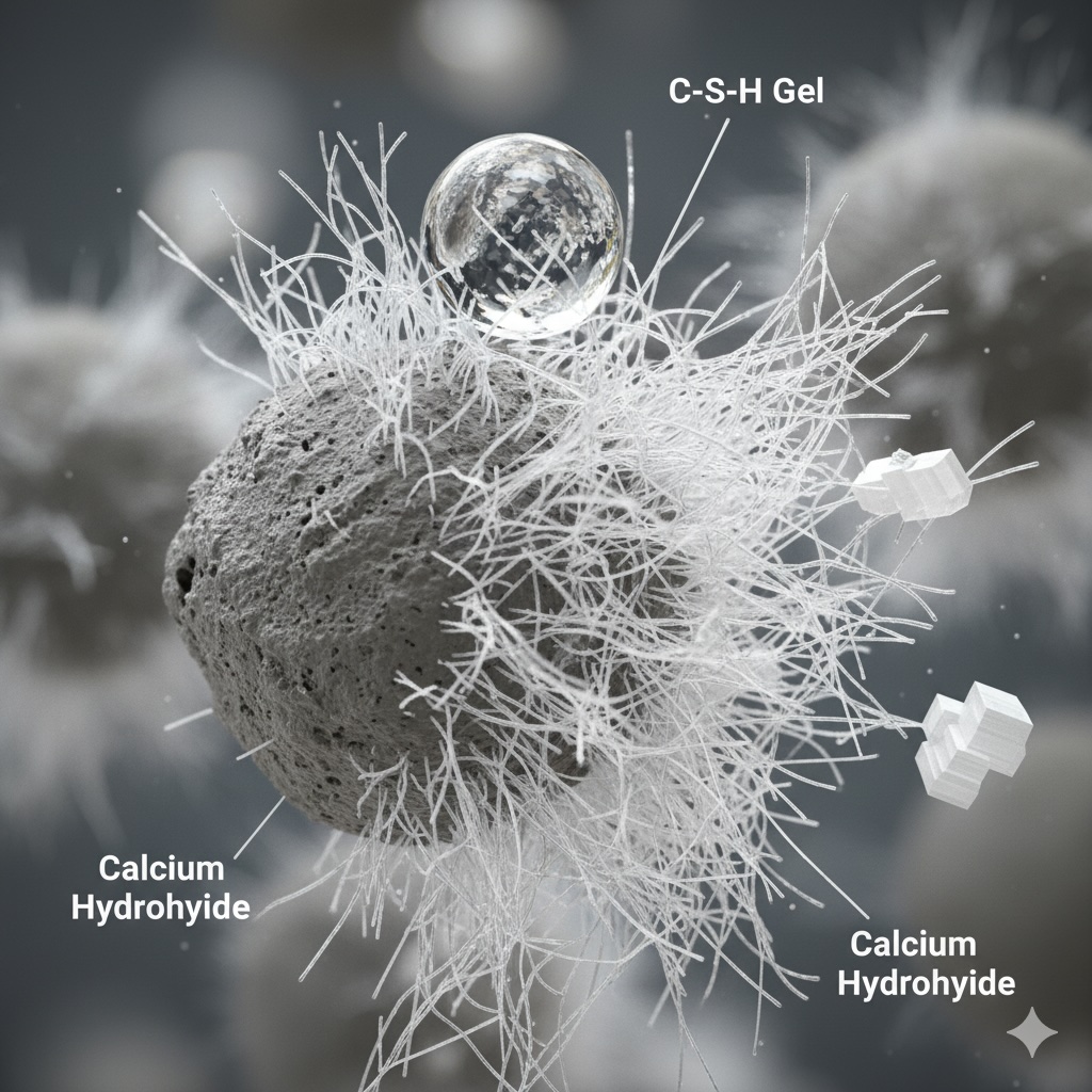 それは、セメントを構成するクリンカー鉱物が水と出会うことで、水和反応という化学反応を起こし、C-S-Hゲルという微細な結晶構造を生成するからです。このゲルがセメント粒子間を埋め、複雑に絡み合うことで、液状だったものが強固な固体へと変化するのです。