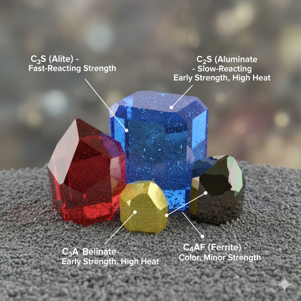 セメント(正確にはポルトランドセメント)は、石灰石、粘土、鉄鉱石などを高温で焼き固めて作られる「クリンカー」を粉砕し、少量の石膏を加えた粉末です。このクリンカーの中には、セメントの硬化反応の主役となる、いくつかの主要な「鉱物相」が含まれています。これらこそが、水と出会うことで化学反応を起こす「容疑者」たちです。