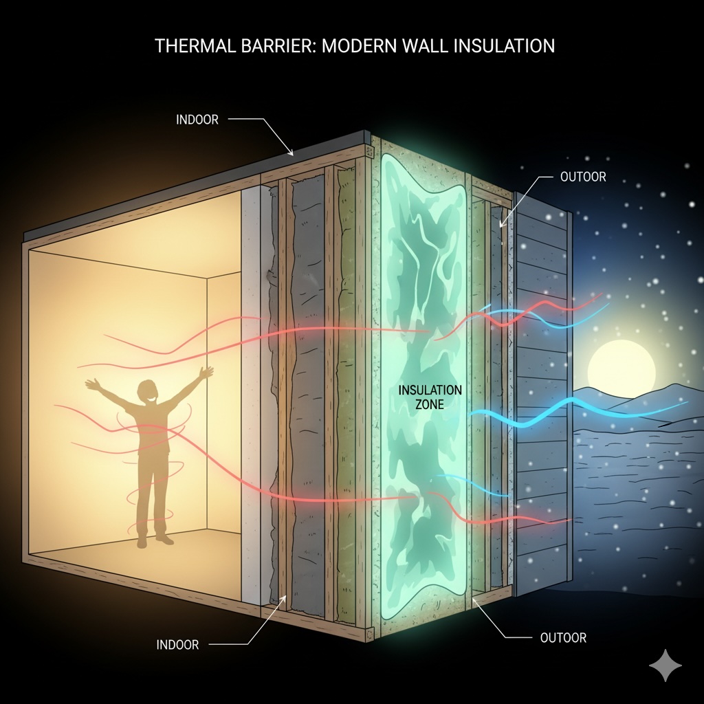 それは、断熱材が、その内部に熱伝導率の低い「動かない空気の層」を大量に作り出し、熱の伝導と対流を物理的に阻止するからです。さらに、アルミ箔などの低放射率素材を組み合わせることで、放射による熱の移動も防ぎます。