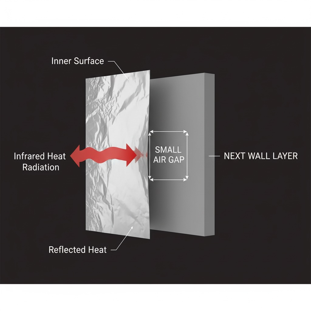 - 特に、反射材が効果を発揮するためには、その反射面と隣の層の間に必ず空気層を確保する必要があります。この反射と空気層の組み合わせが、熱の放射による移動を効率的に抑制します。