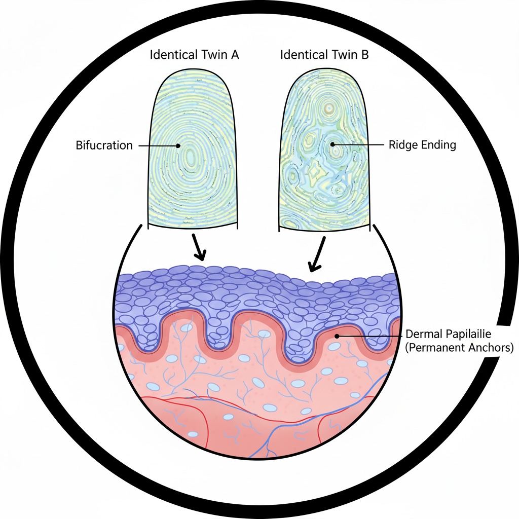 🔹 DNAは「設計図」、指紋は「発生過程の痕跡」 DNAは、私たちの体を構成するすべての細胞に含まれる「生命の設計図」であり、双子ではほぼ同じです。 一方、指紋は、この設計図に基づいて「構築された」体の物理的な「完成形」であり、発生過程のランダムな物理的相互作用の痕跡が刻まれています。