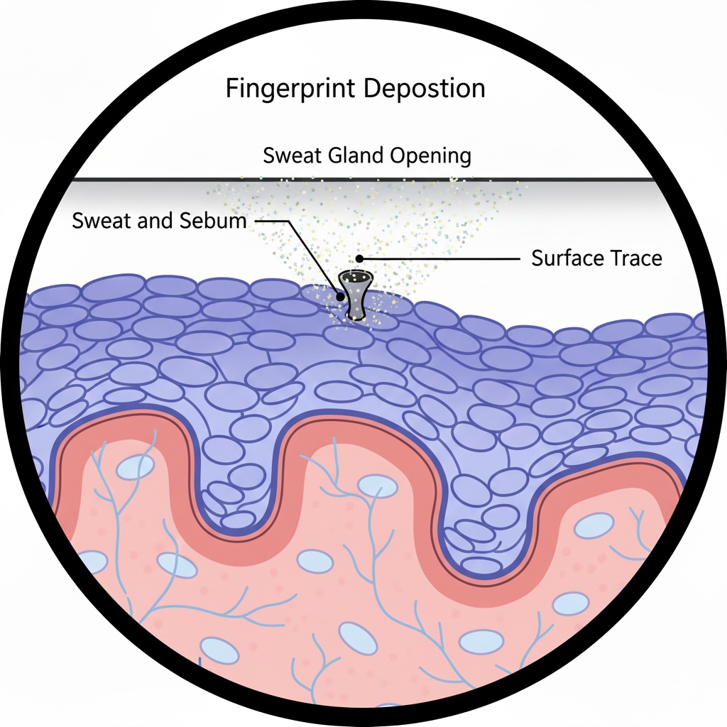 🔹 指紋と汗腺の密接な関係 指紋の隆線の頂点には、汗腺の開口部が並んで存在しています。そこから分泌される汗や皮脂が、私たちが触れた物体の表面に付着することで、指紋は物理的な「痕跡」(潜伏指紋)として残されます。