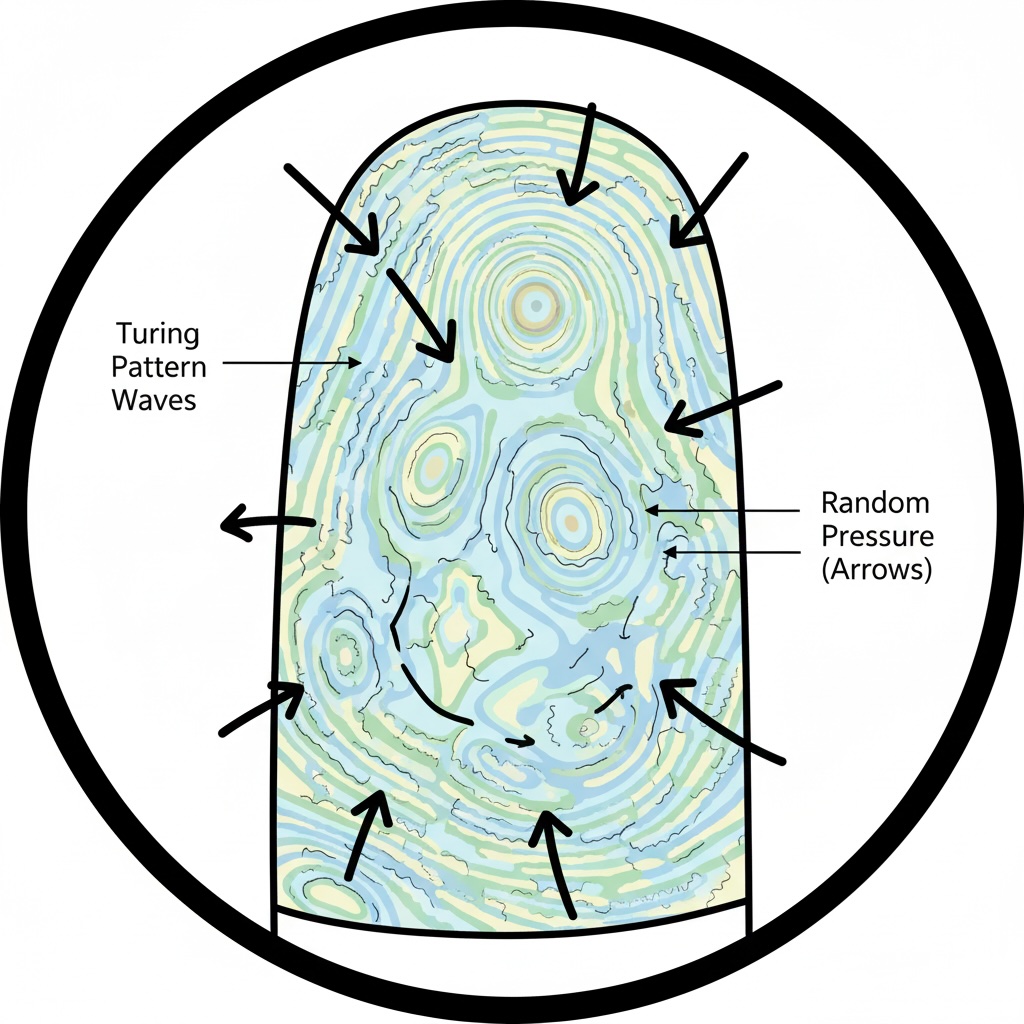 なぜ指紋は人によって違うのか? それは、遺伝子によって制御された化学信号の波(チューリングパターン)が、胎内環境というランダムな物理的要因によって微細な影響を受けながら皮膚に刻み込まれるからです。