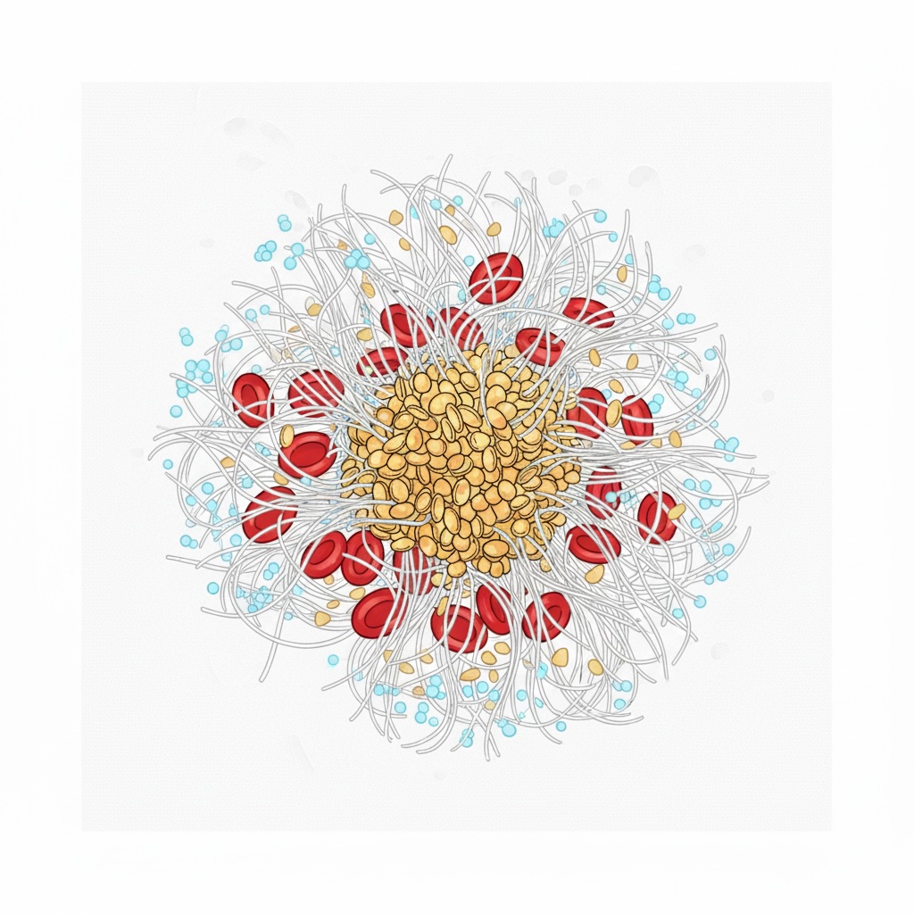 🔹 血栓の完成:「血のゼリー化」 生成されたフィブリンは、網目状の強力なネットワーク(網)を形成します。このフィブリンの網が、一次的な血小板血栓と、その周りに流れてきた赤血球や白血球を大量に絡め取って固定します。この網目が水分(血漿)を閉じ込めて圧縮することで、液体の血液はゼリー状の強固な塊へと変化します。これが、流血を完全に止める「血栓(けっせん)」です。