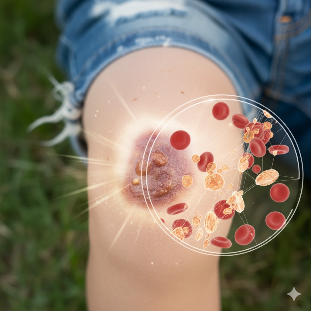 序章:自然治癒のサイン、カサブタの謎 子供の頃、転んで膝を擦りむいた経験は誰にでもあるでしょう。流血に驚いても、しばらくすると血が固まり、数日後には皮膚を覆う「カサブタ(瘡蓋)」ができています。このカサブタは、かゆみを伴い、つい剥がしたくなりますが、皮膚が再生するまで傷口をしっかり守ってくれる「防御壁」です。