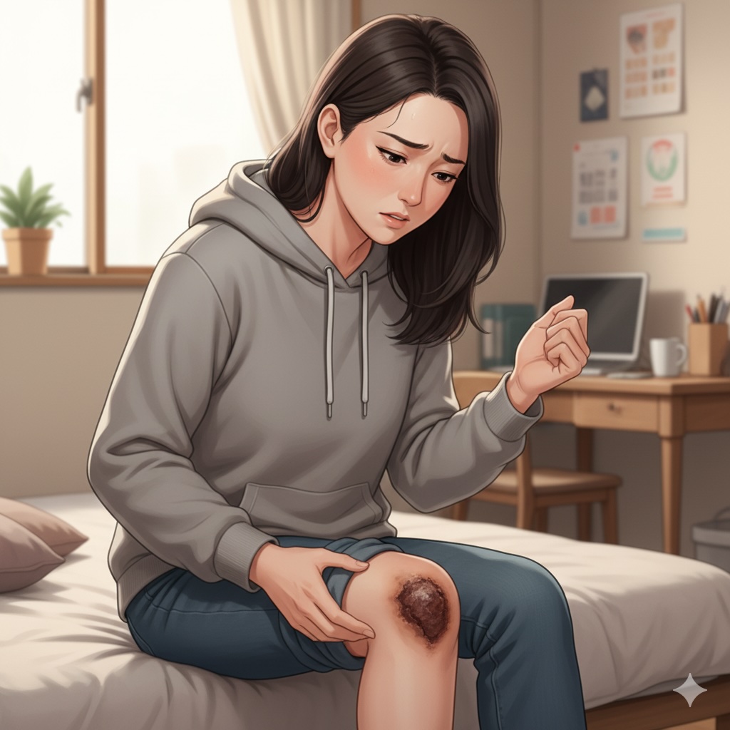 🔹 カサブタの正体:乾燥と圧縮 傷口を塞いだ血栓は、外気に触れることで血漿(水分)を失い、さらに圧縮されます。これにより、硬く乾燥した暗赤色〜黒っぽい塊になります。これこそが、私たちが目にする「カサブタ」です。