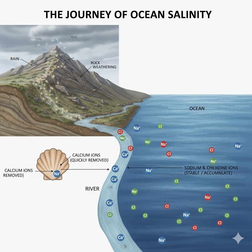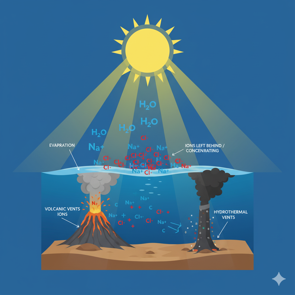 🔹 河川水による継続的な供給 河川水には、陸地で岩石から溶け出した微量のイオン(塩分のもと)が常に含まれています。この運搬プロセスは、地球の歴史が始まって以来、何十億年もの間、途切れることなく続いてきました。一度海に運ばれた塩分は、ほとんどが陸地に戻ることはなく、海水中に「蓄積」されていく一方なのです。