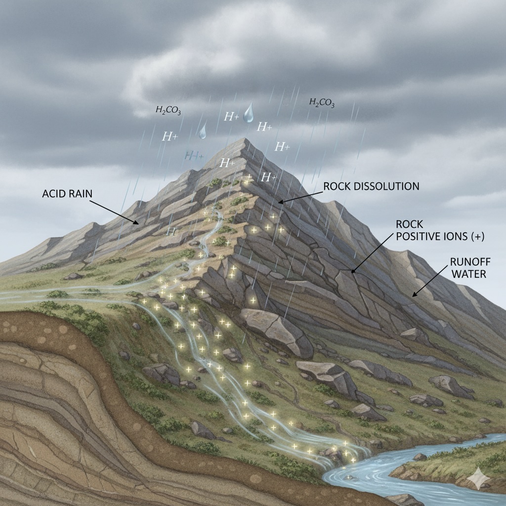 🔹 秘密兵器:雨水(弱酸性)と岩石の化学反応 空から降る雨水は、空気中の二酸化炭素を吸収して弱酸性を帯びています(炭酸)。この弱酸性の雨水が、地表の岩石に降り注ぐと、岩石の主成分であるさまざまな鉱物とゆっくりと化学反応を起こし、それらを分解します。