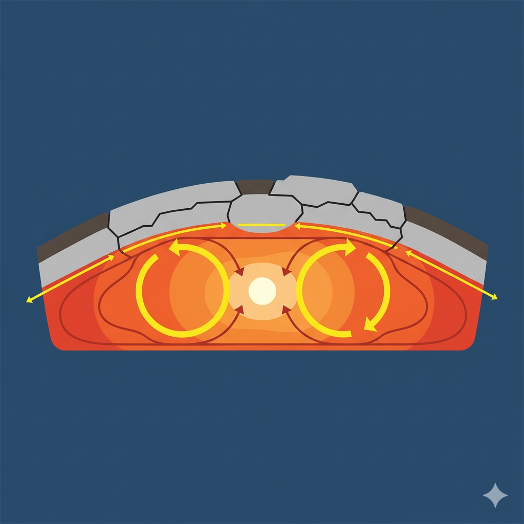 🔹 活性化のスイッチ:マントル対流 プレートを動かす巨大な力の根源は、地球内部の熱によって引き起こされるマントル対流です。温められたマントル物質が上昇し、冷やされて再び下降するという、巨大なリサイクル(対流運動)が、プレートを引っ張り、押し、移動させているのです。