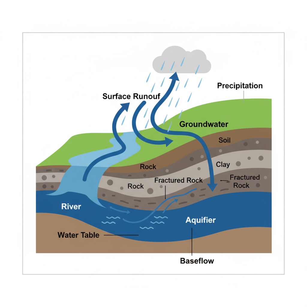 ⏳ 補足:水が旅する「滞留時間」の秘密 地下水として貯えられた水が再び川に戻るまでには、数週間から数年、深い帯水層では数百年以上かかることもあります。この「水の滞留時間」が非常に長いおかげで、たとえ一時的に雨が降らなくても、過去の降水が蓄えられた水がゆっくりと供給され続け、川は流れを維持できるのです。