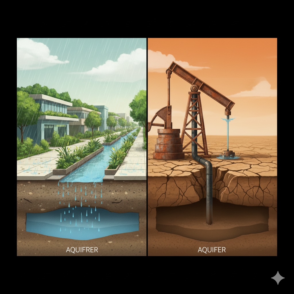 🔹 地下水涵養の重要性 川の安定供給を支える地下水を守るためには、都市開発において、雨水を地中に浸透させるための透水性舗装や緑地帯の確保(涵養)が極めて重要です。