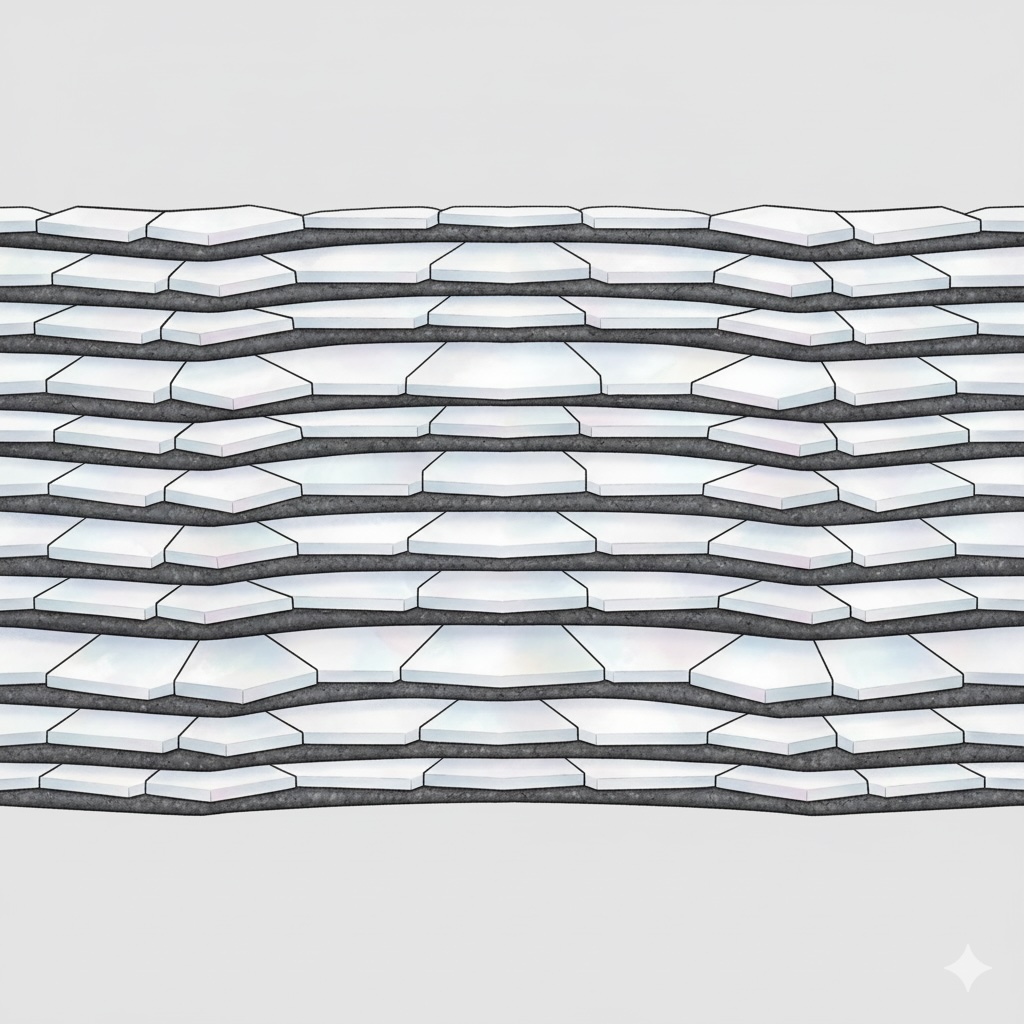 🔹 驚異的な強度と靭性 真珠層は、脆い炭酸カルシウムの結晶を、柔らかな有機質の膜が「クッション」のように繋ぎ止める構造により、主成分単体よりも約3000倍も強い、驚異的な強度と靭性を兼ね備えています。