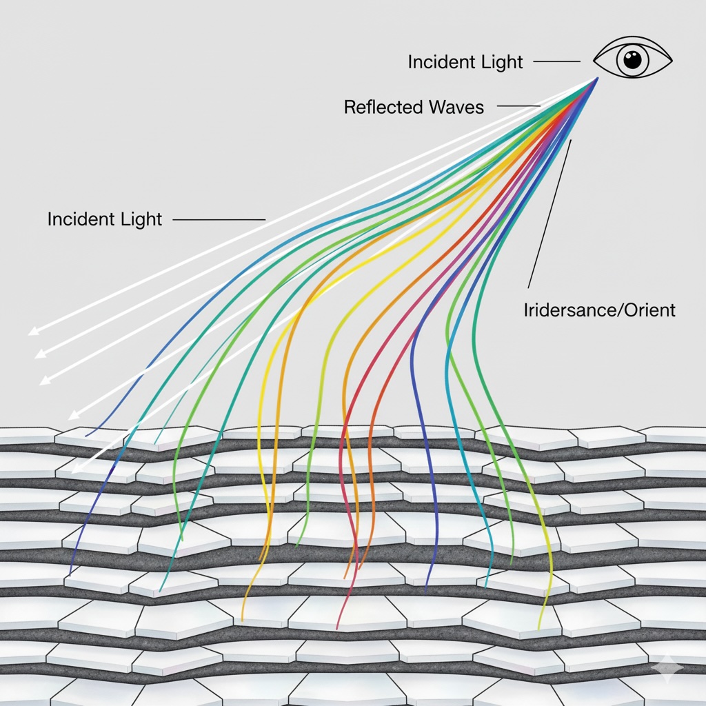 なぜ真珠は光るのか? それは、真珠層がアラゴナイトの薄い結晶層と有機質の膜が、ナノメートルスケールで均一に何千層も積み重なった構造をしているからです。この多層構造に入り込んだ光が、各層で屈折・反射し、互いに干渉することで、あの神秘的な虹色の輝き(テリ)を生み出しているのです。