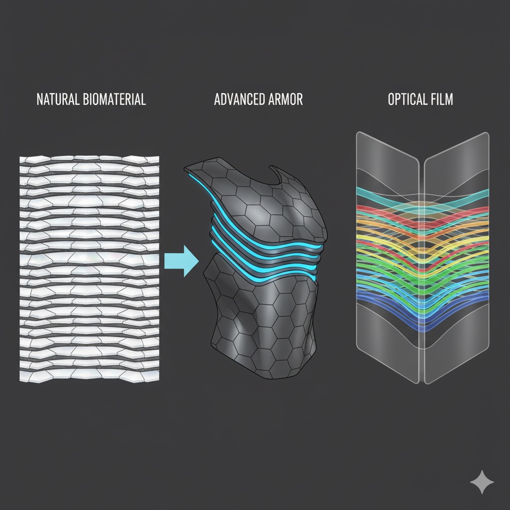 🔹 バイオミメティクスと新素材 この「硬い層と柔らかい層の繰り返し」という真珠層の仕組みは、バイオミメティクス(生物模倣技術)の究極の例として注目されています。科学者たちは、この構造をヒントに、軽量でありながら高い強度を持つ、宇宙船の外壁や医療用の人工骨、そして光を自在に操る光学フィルムといった新素材の開発を目指しています。