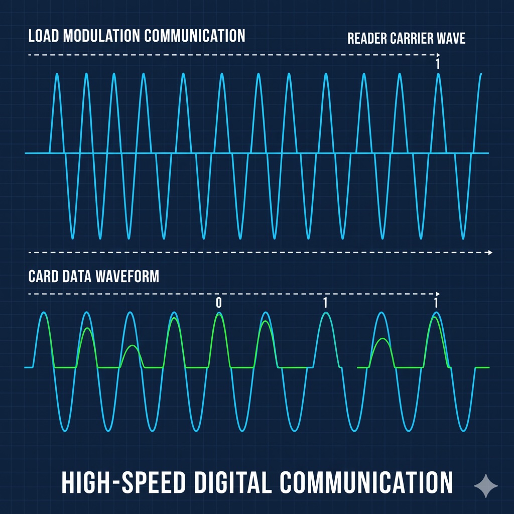 ICカードは、受け取った電磁波のエネルギーを利用して、自らに書き込まれた決済情報やID情報などのデジタルデータをリーダーに返します。このとき、カードは自身のアンテナコイルを微細にON/OFF(スイッチング)させることで、リーダーから送られてくる電磁波の強度をわずかに変化(変調)させます。