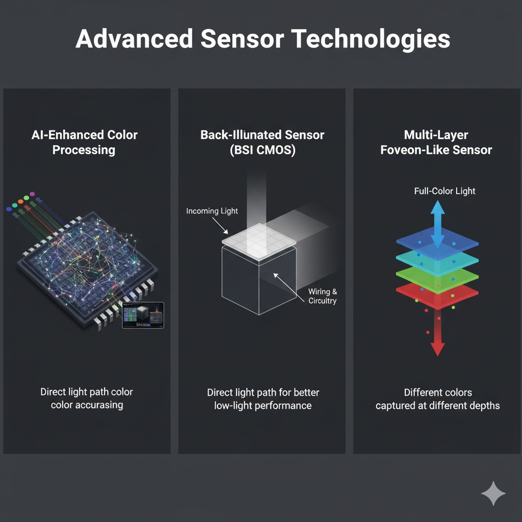 🔹 高感度化とノイズ低減 近年、裏面照射型(BSI)CMOSなど、構造を工夫することで光の集光効率を高め、ノイズを劇的に低減させる技術が主流となり、暗い場所での撮影能力が飛躍的に向上しました。