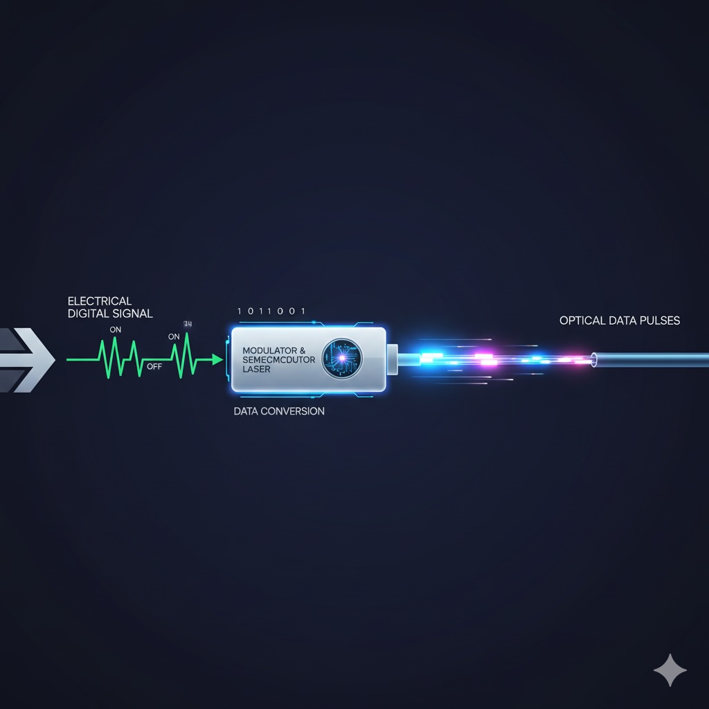 データは、電気信号から半導体レーザーによって光信号に変換され、ON(1)とOFF(0)のパルスとして伝送されます。光は秒速約30万キロメートルという宇宙で最も速い速度で移動するため、圧倒的な高速通信が可能です。