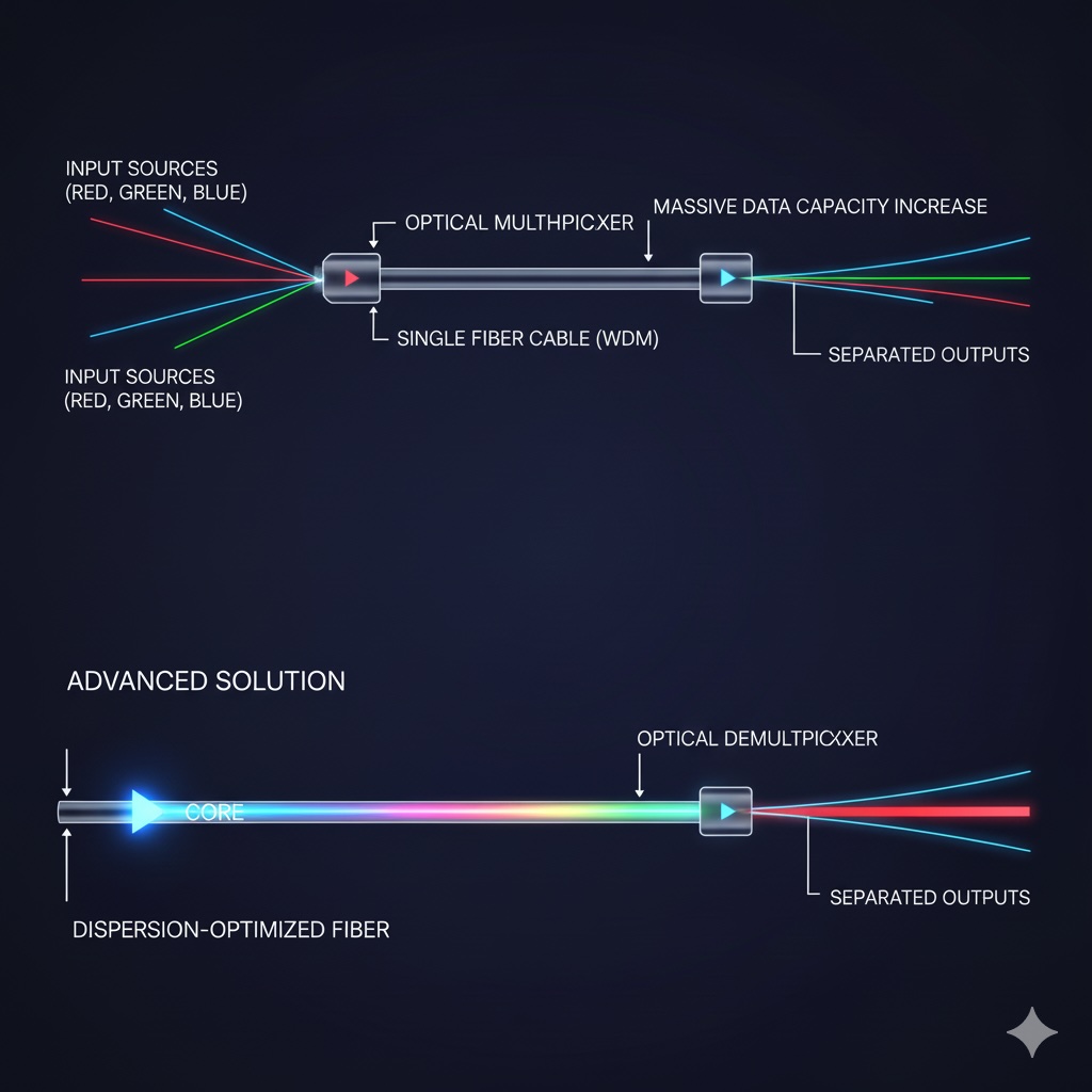 🔹 WDM(波長分割多重) 一つの光ファイバーの中に、波長の異なる複数のレーザー光(色の異なる光のイメージ)を同時に流し込み、それぞれ独立した信号として伝送する技術です。これにより、一本のファイバーで伝送できる情報量を劇的に増やしています。