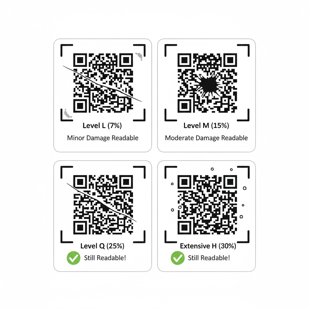 QRコードの設計は、破損の程度に合わせて、4段階の誤り訂正レベルをユーザーが設定できるようになっています。