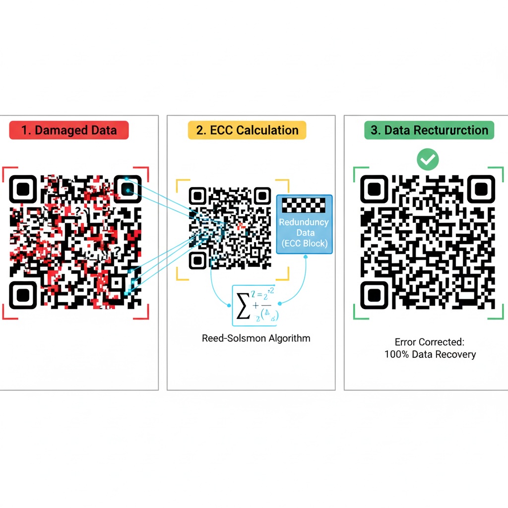 それは、QRコードが位置検出パターンで正確な位置を把握した後、データ本体と一緒に、誤り訂正符号(ECC)という「冗長な予備情報」を記録しているからです。このECCは、リード・ソロモン符号という数学的アルゴリズムに基づいており、コードの最大30%が破損しても、残りの情報から失われたデータを数学的に復元できるという、完璧な設計になっているのです。