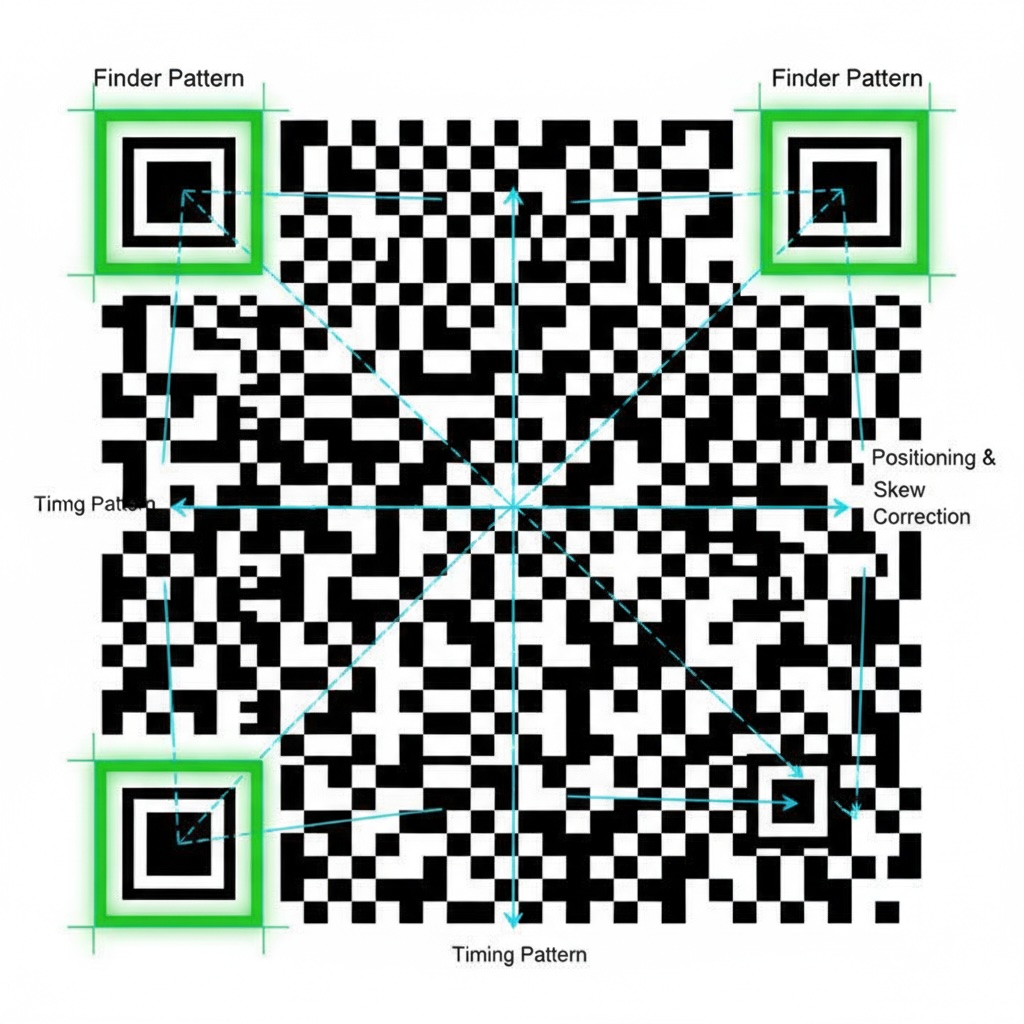 QRコードの三つの角には、特徴的な「回りの細い枠と中の太い四角」という位置検出パターン(Finder Pattern)が配置されています。このパターンにより、読み取りデバイスは、コードの正確な位置と傾き、大きさを瞬時に把握できます。この瞬時の位置特定能力が「クイック・レスポンス」を可能にしています。
