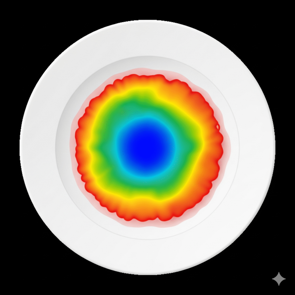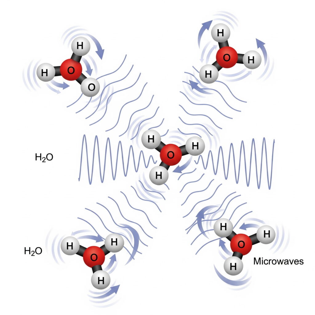 マイクロ波は電場を高速で反転させるため、水分子は「右へ左へ」と絶えず向きを変えようとします。その結果、分子同士がぶつかり合って 運動エネルギー(熱) が生じ、食材全体の温度が上がるのです。