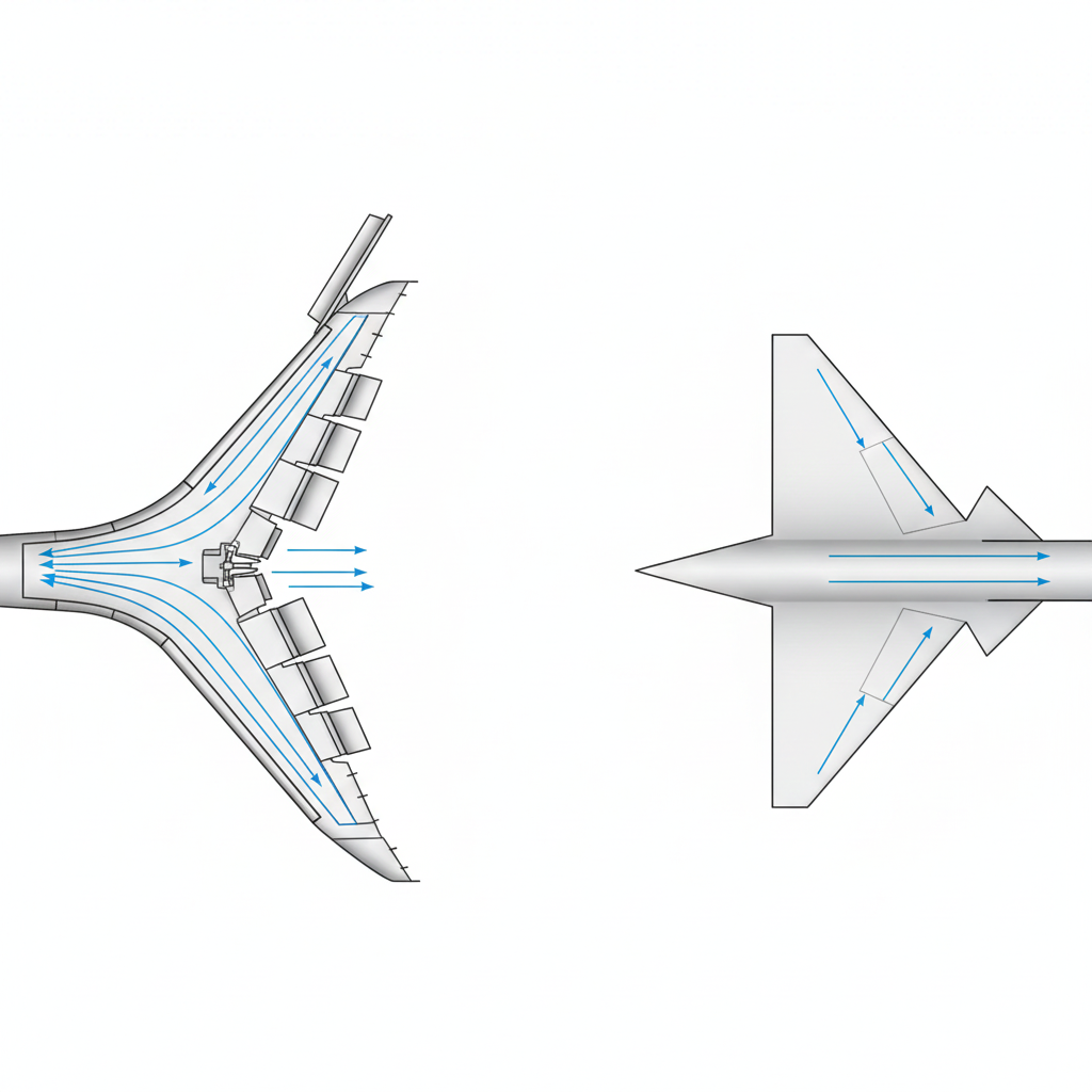 🔹 超音速機の設計 超音速機では、空気の流れが音速を超えるため、衝撃波の影響が大きくなります。そのため、翼型は薄く、先端が鋭いデルタ翼など、抵抗(抗力)を最小限に抑えることに重点を置いた設計が採用されます。