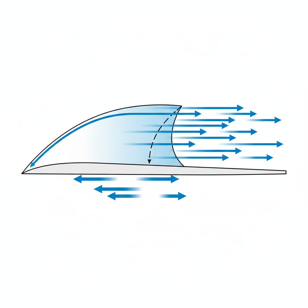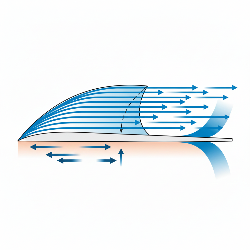 揚力を支えるもう一つの力:コアンダ効果と作用・反作用 揚力発生には、圧力差に加え、コアンダ効果も重要な役割を果たします。これは、翼の上側の空気が膨らんだ翼面にしっかりと張り付いて流れ続ける性質です。これにより、気流が大きく下向きに変えられ(ダウンウォッシュ)、この下向きの運動量変化に対する反作用(作用・反作用の法則)が、飛行機を押し上げる力としても働きます。