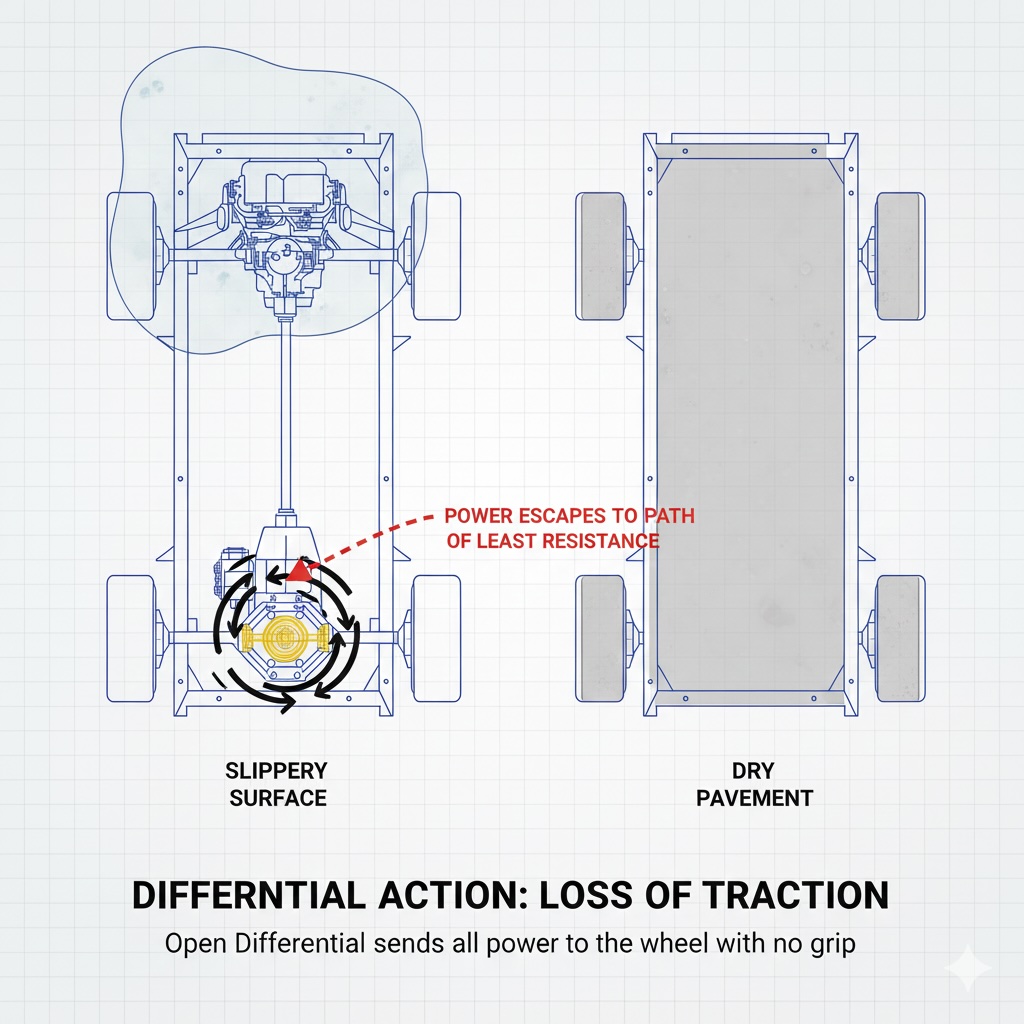 デフは、動力を「抵抗の少ない方」へと多く伝達する性質があります。これは、片側の駆動輪がぬかるみや氷の上で完全に空転(抵抗ゼロ)した場合、デフは抵抗のない空転側の車輪に全ての動力を伝えてしまい、車は身動きが取れなくなってしまうという問題を引き起こします。