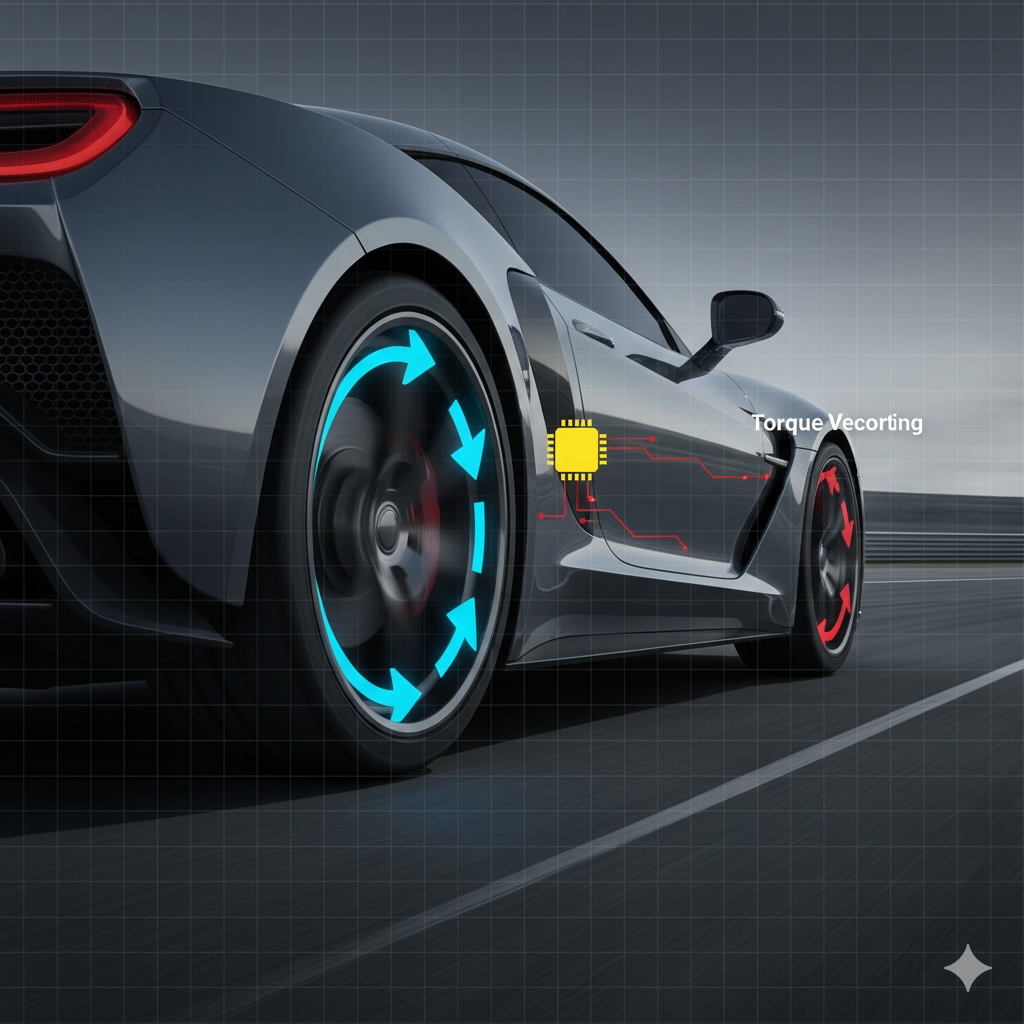 🔹 トルクベクタリング 最新の四輪駆動システムでは、カーブを曲がる際に外側の車輪に積極的に追加のトルクをかける技術(トルクベクタリング)が採用されています。これにより、車をカーブの内側へ引き込む力を生み出し、より速く、より安定したコーナリングを可能にしています。