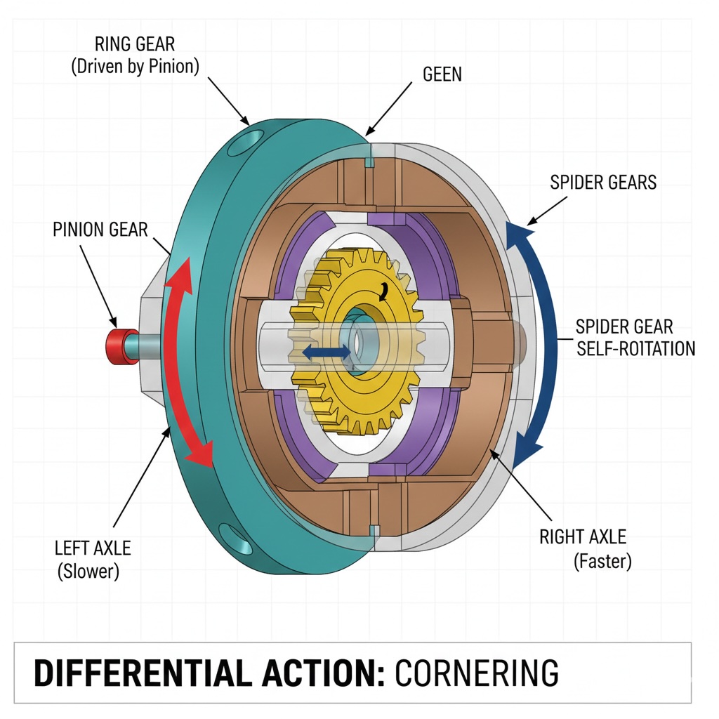 - カーブ時: 内輪に抵抗がかかると、スパイダーギアは自転を開始し、内輪側が遅くなった分だけ、反対側の外輪側へ『追加の回転力(トルク)』を振り分けます。