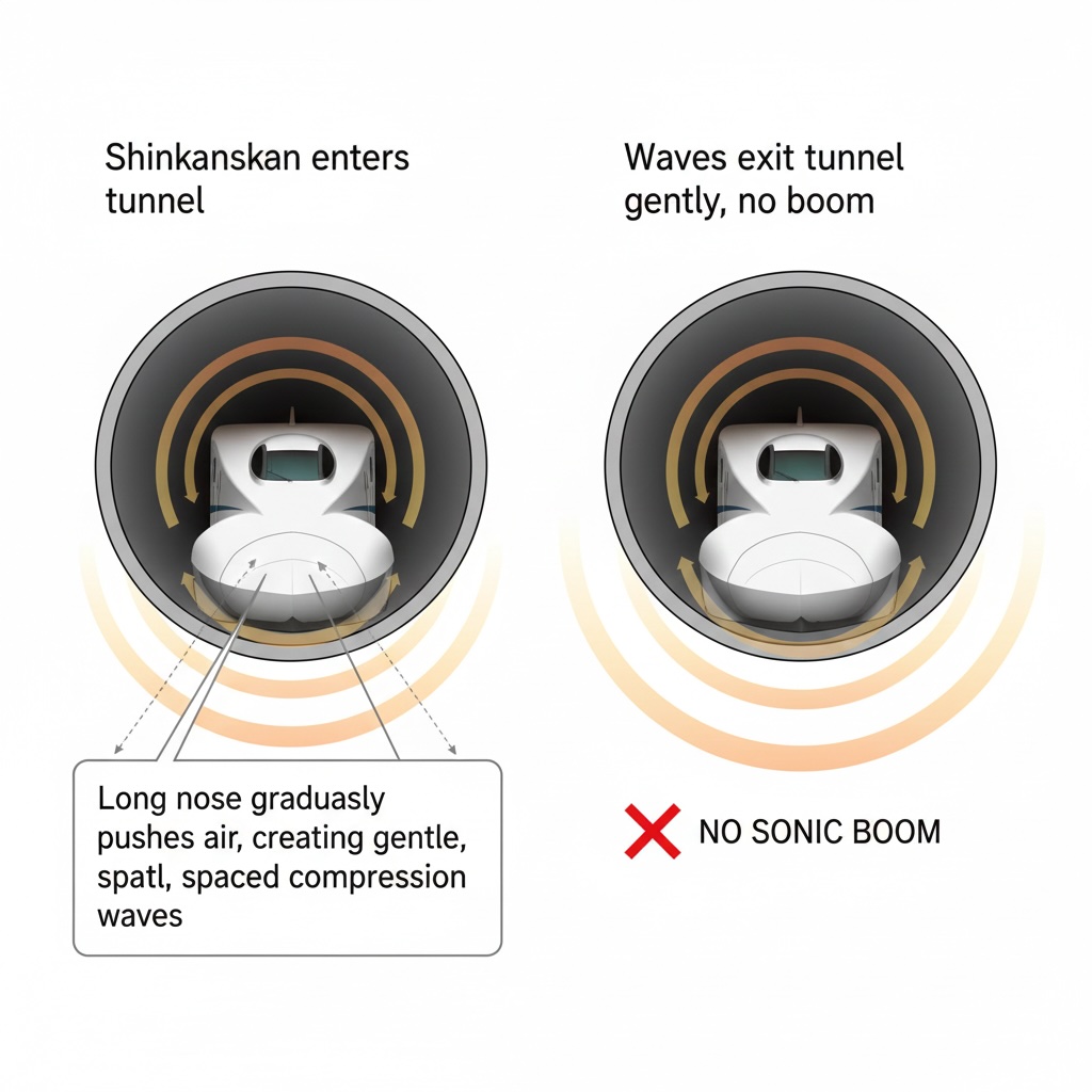 高速でトンネルに突入すると、前面がトンネル内の空気を圧縮し、その圧縮波が出口で破裂音(ドーンという音)として放出されます。これは騒音公害の原因となるだけでなく、エネルギーの損失でもあります。