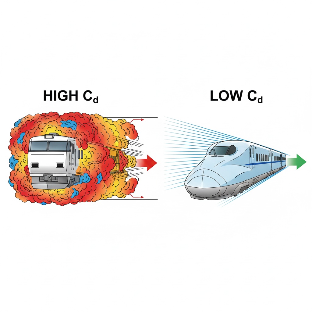 新幹線の走行に必要なエネルギーの約7割から8割は、高速域では空気抵抗の克服に費やされます。この抵抗の小ささを示す指標が空気抵抗係数(Cd値)です。最新の車両は、Cd値を極限まで下げることで、同じ速度でもより少ないエネルギーで走行できるように設計されています。この「形状の最適化」こそが、省エネと高速化を両立させるカギなのです。