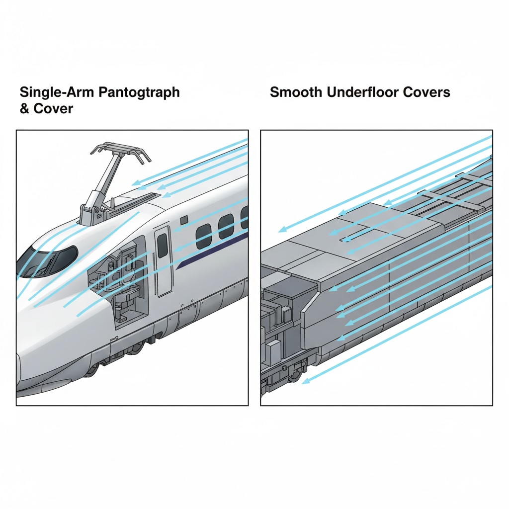 実は、車体の上だけでなく「下」も重要です。車体とレールの間の狭い隙間を空気が高速で通過する際、地面効果(Ground Effect)による抵抗や、台車周りの巻き上げ騒音が発生します。 これを防ぐため、最新の新幹線は床下機器をカバーで完全に覆い(フルカバー)、車体下部も滑らかな平面にすることで、地面との間の空気の流れを整え、抵抗と騒音を極限まで減らしています。