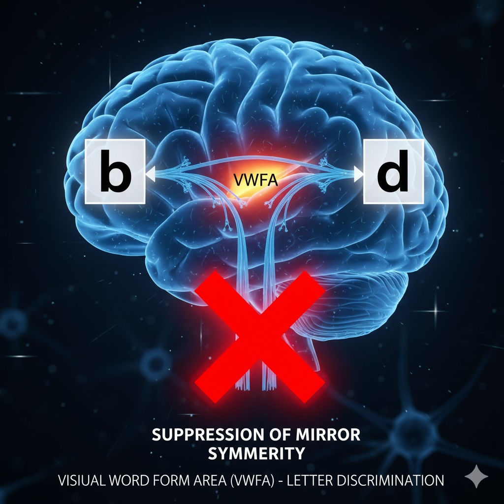 文字を正確に読むためには、「d」と「b」のように、左右反転が意味を変える文字を厳密に区別する必要があります。このため、文字認識(VWFA)は、汎用的な「左右反転を無視するシステム」を意図的に抑制します。
