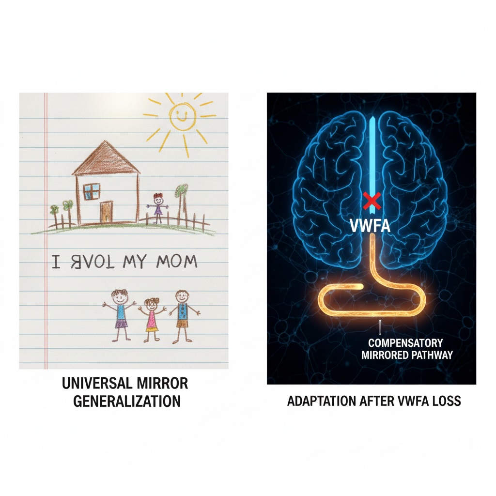 🔹 ディスレクシアと汎用システムの過剰活性 一部のディスレクシア患者は、鏡文字を健常者よりも素早く認識できる傾向があります。これは、彼らの脳が文字を処理する際、左右反転を厳密に区別するVWFAの特化が不十分であり、物体認識の汎用システム(左右反転を無視する)が過剰に強く働いているためではないか、という仮説が有力視されています。彼らは文字を「物体」として認識しすぎてしまい、文字の向きによる意味の違いを捉えにくいのです。
