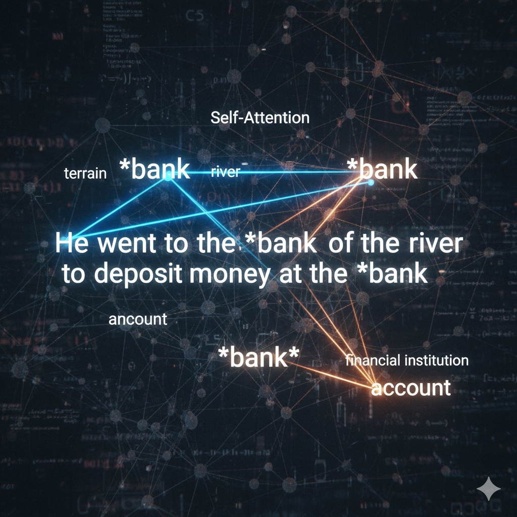例えば、「彼は川の土手(bank)にある銀行(bank)に行った」という文。AIは「bank」という単語を処理する際、周囲にある「川」や「お金」といった他の単語に「注意(Attention)」を向けます。