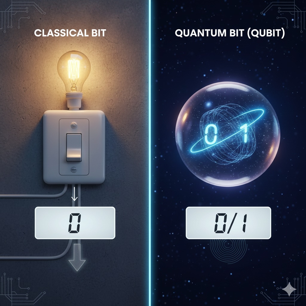 私たちが普段使っているPCやスマホ(古典コンピューター)は、情報の最小単位として「ビット」を使います。これは、スイッチのON(1)かOFF(0)のどちらか一方の状態しか取れません。